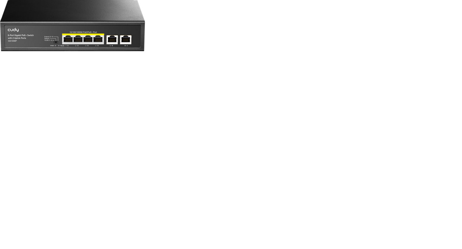 6-poorts 10/100/1000M PoE+ switch, 4-poorts 10/100/1000 BASE-T Gigabit PoE-poorten, 2-poorts 10/100/1000 BASE-T Gigabit Uplink-poorten, 802.3at/af, VLAN-modusondersteuning voor poort #1 ~ #4, ondersteuning voor uitbreidingsmodus voor poort #3 ~ #4, ventilatorloos, ±4KV overspanningsbeveiliging, Watchdog, 65W intern