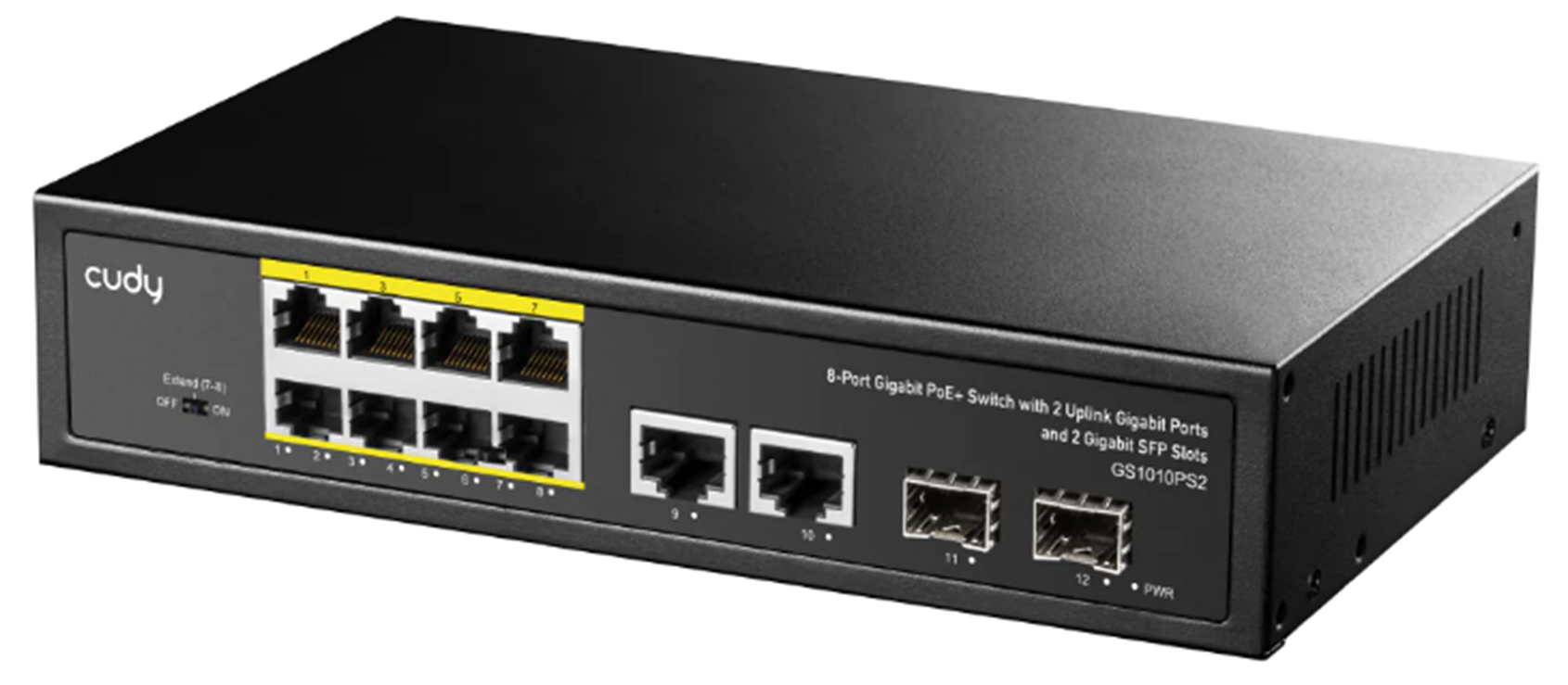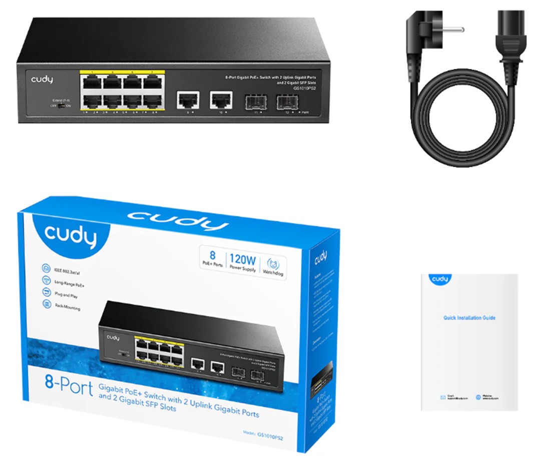 8-10/100/1000 BASE-T Gigabit-poorten, 2-poorts 10/100/1000 BASE-T Gigabit Uplink-poorten, 2-1000 BASE-X SFP-slot, 8-poorts IEEE 802.3at PoE+-injector, Ondersteunt PoE-opstarten tot 30 W voor elke PoE-poort, uitbreidingsmodus (poort # 7 en # 8 ondersteunen zendafstanden tot 250 m bij 10 Mbps), poortbliksembeveiliging, watchdog, 120 W intern
