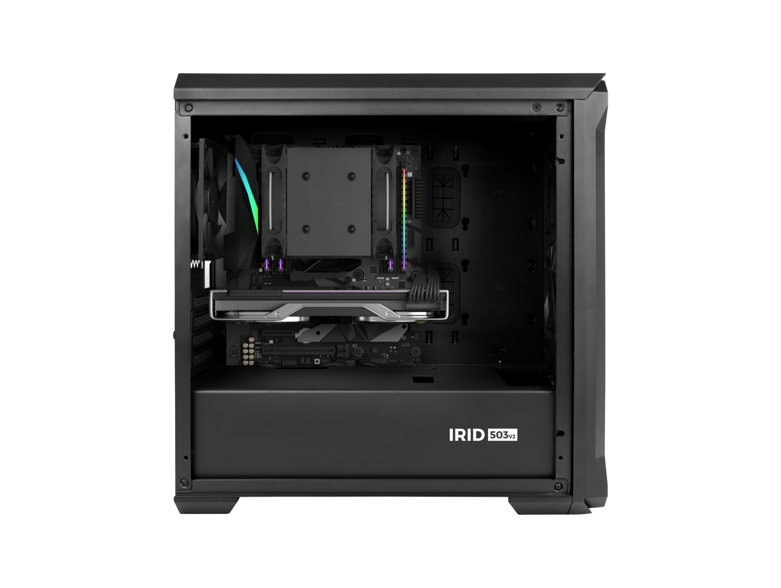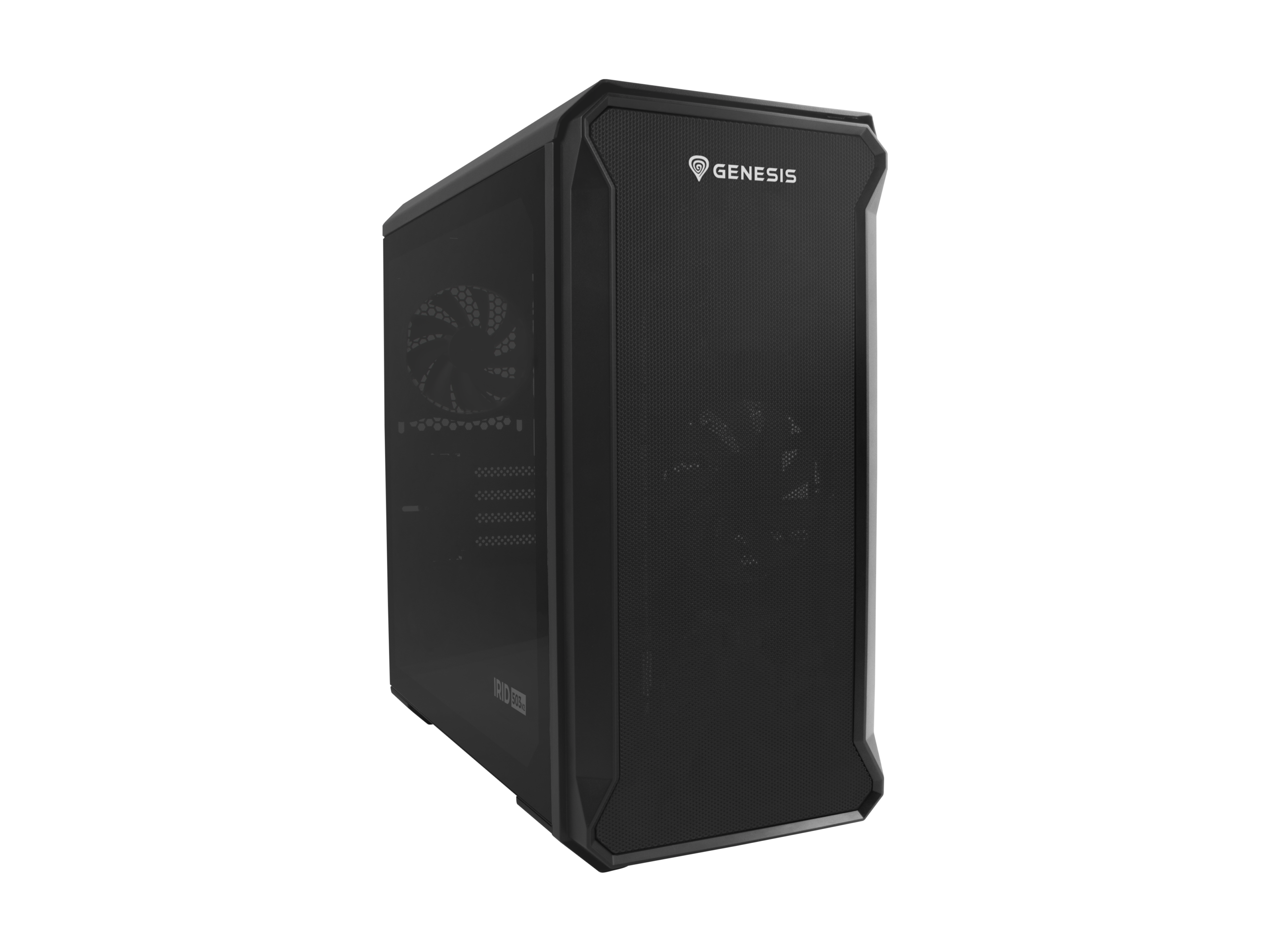 De Irid 503 V2 heeft een geperforeerde voorkant en het zijpaneel is gemaakt van helder gehard glas, waardoor u de werkende componenten in de gaten kunt houden. De kast is voorzien van twee Genesis Oxal 120 ventilatoren, die perfect voor een goede luchtcirculatie zullen zorgen.