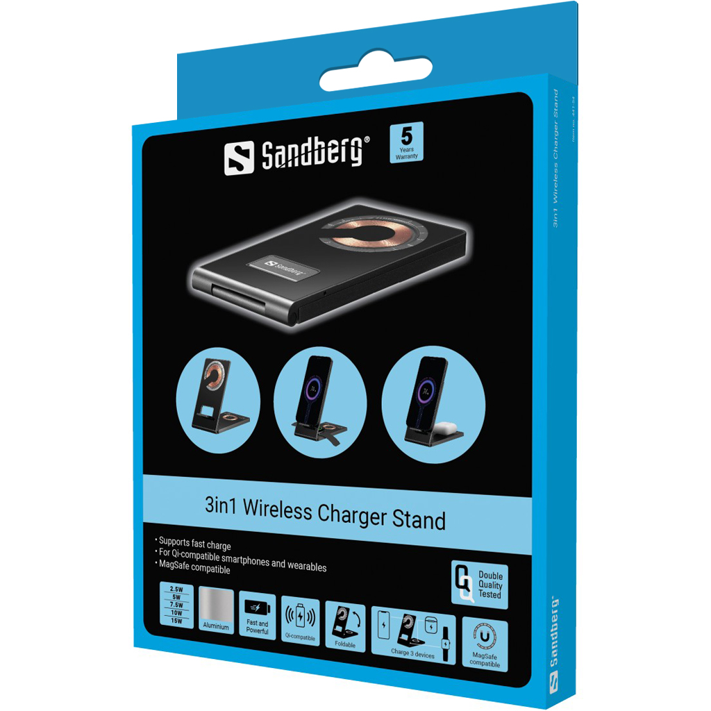 Met de Sandberg 3-in-1 Wireless Charger Stand kun je je smartphone, Airpods en smartwatch draadloos en tegelijkertijd opladen. De oplaadplaat voor smartphones is magnetisch en kan daarom worden bevestigd aan iPhones met MagSafe. Andere Qi-compatibele telefoons kunnen ook worden opgeladen op de oplaadplaat. Plaats ze gewoon op de kleine uitklapbare houder. De hele standaard kan worden ingeklapt en eenvoudig onderweg worden meegenomen.